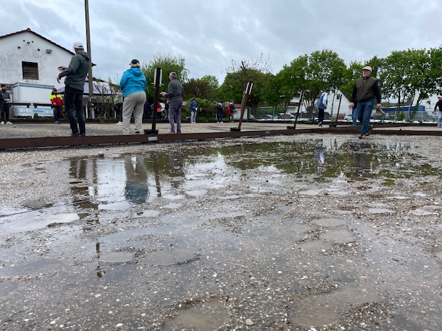 Nach heftigem Regen in der Nacht war es bitter kalt und die Plätze waren vom Regen gezeichnet. Zwei Plätze waren unbespielbar, die 10 Hauptbahnen waren zum Teil extrem matschig. Die Hausherren kamen damit zunächst besser zurecht und besiegten unser Triplette 1 mit 13:3. Etwas besser machten es Petra, Hein und Rolf. In einem engen Spiel konnten sie mit 13:11 ausgleichen.