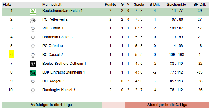 Vor zwei Jahren nach dem Wiederaufstieg starteten wir mit 0:2 in Gründau. Im letzten Jahr gab es ein 2:0. Diesmal ein 1:1, mit dem das Team gut in die Saison gestartet ist. Wie im Vorjahr ist es eine enge Liga, jedes Team kann geschlagen werden, knappe Niederlagen sind ebenfalls möglich. Die Stimmung war trotz der widrigen Umstände sehr gut. Weiter geht es am Pfingstsamstag in Steinheim. Dort geht es wieder gegen die Heimmannschaft, danach gegen die Rumkugler und zum Abschluss gegen Bornheim. Das Ziel ist, nach dem nächsten Spieltag drei Siegpunkte auf dem Konto zu haben.