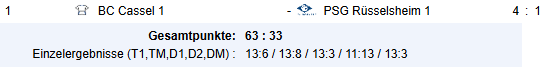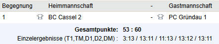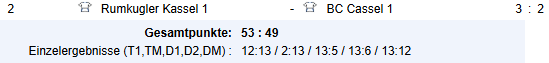 In den Doubletten musste eine Partie auf den Wegen ausgetragen werden. Dort holten Steven und Danko mit 13:11 die 2:1 Führung. Petra und Rolf sowie Egon und Hein kämpften mit dem Matsch und dem Gegner. Petra und Rolf lagen schon 6:12 hinten, machten dann einen Sechser und blieben beim 12:12 eiskalt. 13:12, die Partie war gewonnen. Egon und Hein lagen schnell 0:10 zurück, für Egon kam David ins Spiel. David und Hein kamen auf 11:11 ran, es entwickelte sich ein echtes Marathon Match. Nach weit über zwei Stunden setzte sich Gründau durch, am Ende stand ein hart erkämpfter erster Siegpunkt (53:60 Kugeln)