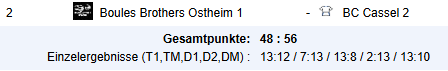 Im letzten Jahr gab es an gleicher Stelle ein 4:1 Sieg gegen Ostheim. Beide Tripletten wurden auf den Wegen gespielt. Petra, Hein und Rolf hatten das Spiel jederzeit im Griff und holten ein 13:7. Steven, Egon und David spielten auf Augenhöhe und hatten die Chance, mit dem eingewechselten Danko, den Sack zuzumachen. Chance vertan und das Spiel wurde mit 12:13 verloren, wieder ein 1:1 nach den Tripletten. Die Aufstellungen für die Doubletten wurden besprochen. Danko spielte mit Hein wieder auf den Wegen und mit 13:2 gingen wir in Führung. 1:11 bei Egon und Steven und 9:9 bei Petra und Rolf. Petra und Rolf gaben einen Punkt ab und kassierten danach einen Dreier. 13:9 für Ostheim und das 2:2. Beim entscheidendem Doublette kam David für Steven in die Partie und brachte frischen Schwung und gute Legekugeln. Bei 8:11 war wieder alles möglich. Dann aber keine zwingende Eröffnung und auf die erste gegnerische Kugel wurden fünf weitere BCC Kugeln verlegt. Ostheim sagte „Danke“ und legte die 13. Damit hätte es wieder ein 4:1 sein können, es wurde aber nur ein 2:3 (56:48 Kugeln).