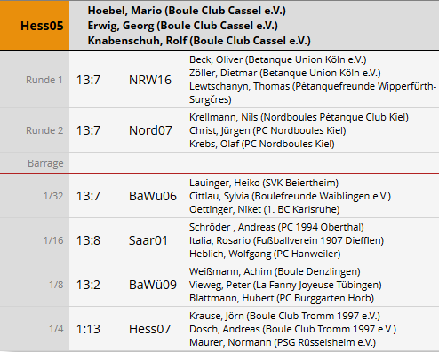 Im Viertel-Finale war dann Ende für uns gegen die späteren deutschen Meister Andreas Dosch, Jörn Krause und Normann Maurer.  Die drei Boule-Freunde aus Hessen spielten wie aus einen Guss und speziell Andreas Dosch wie ein Weltmeister.